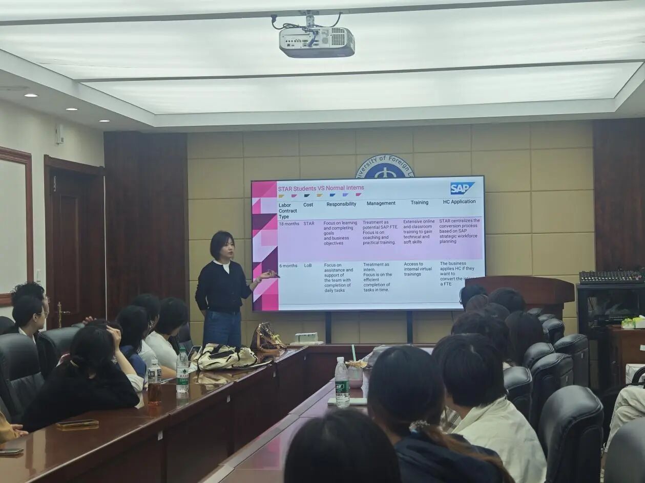 为助力同学们精准把握行业动向,拓展高质量就业渠道,学院组织开展“名企进校园”系列活动。10月15日,学院邀请世界500强企业SAP(思爱普)公司在10A111会议室召开了2027届校园招聘专场宣讲会,学院2023级67名学生参加。