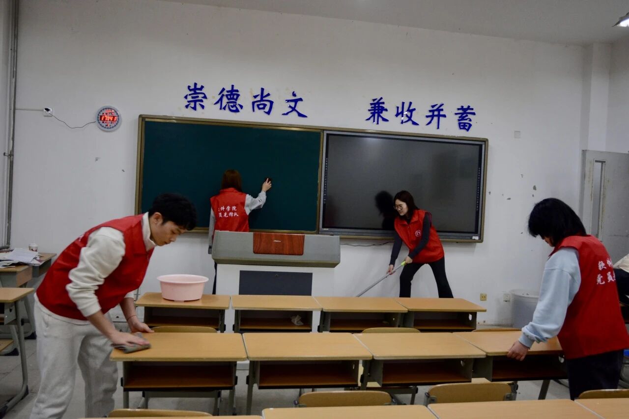 党员先锋队拿起工具,在学院教学楼的公共区域开展义务劳动。清理卫生死角、整理共享空间……党员们用自己的汗水换来教学环境的整洁,也用实际行动诠释了“劳动最光荣”。